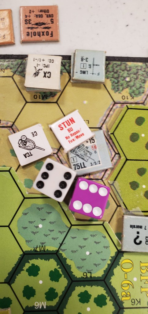 At this point, the feeble Sherman (whose main gun had very little chance of penetrating his Panther’s frontal armor (a critical hit would be required) used its pop gun to lob a High Explosive shell down four orchard hinderances onto the turret of the Panther, causing the Tank commander to take a morale check. But no worries… these are elite Panzer Lehr troops…