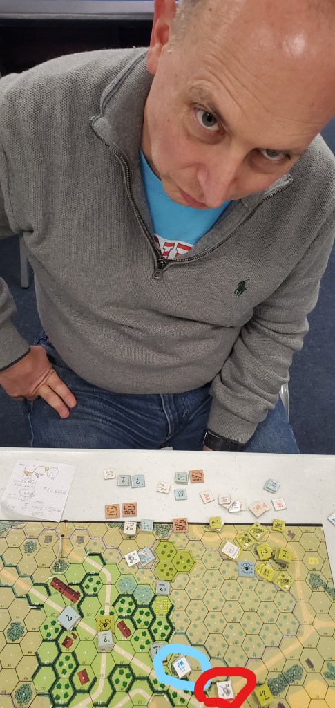 With oblivious insouciance Conscript Davidus Varuski drove his first Sherman Mark 4 with 3 inch gun down a lane and espied some of Conscript Andrewskis Troops in a concealed position. But Varuski was oblivious to a hidden Panzershrek two hexes away!
